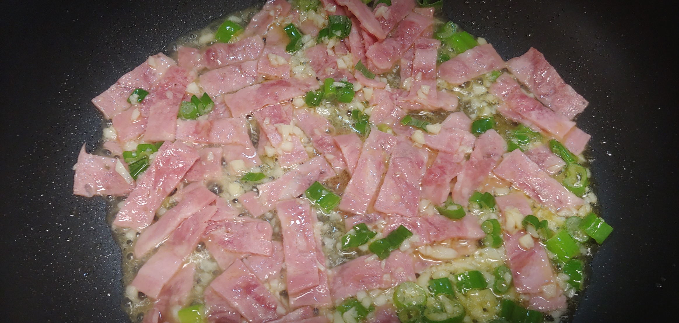 3. 팬에 버터 1조각(20~30g, 또는 버터없으면 일반 오일 3~4T로 쓰셔도 됩니다.)을 약불로 녹이고, 파와 다진마늘을 넣어 볶아줍니다. 마늘과 파의 향이 올라올 때 쯤, 베이컨을 넣고 강불로 볶아줍니다.