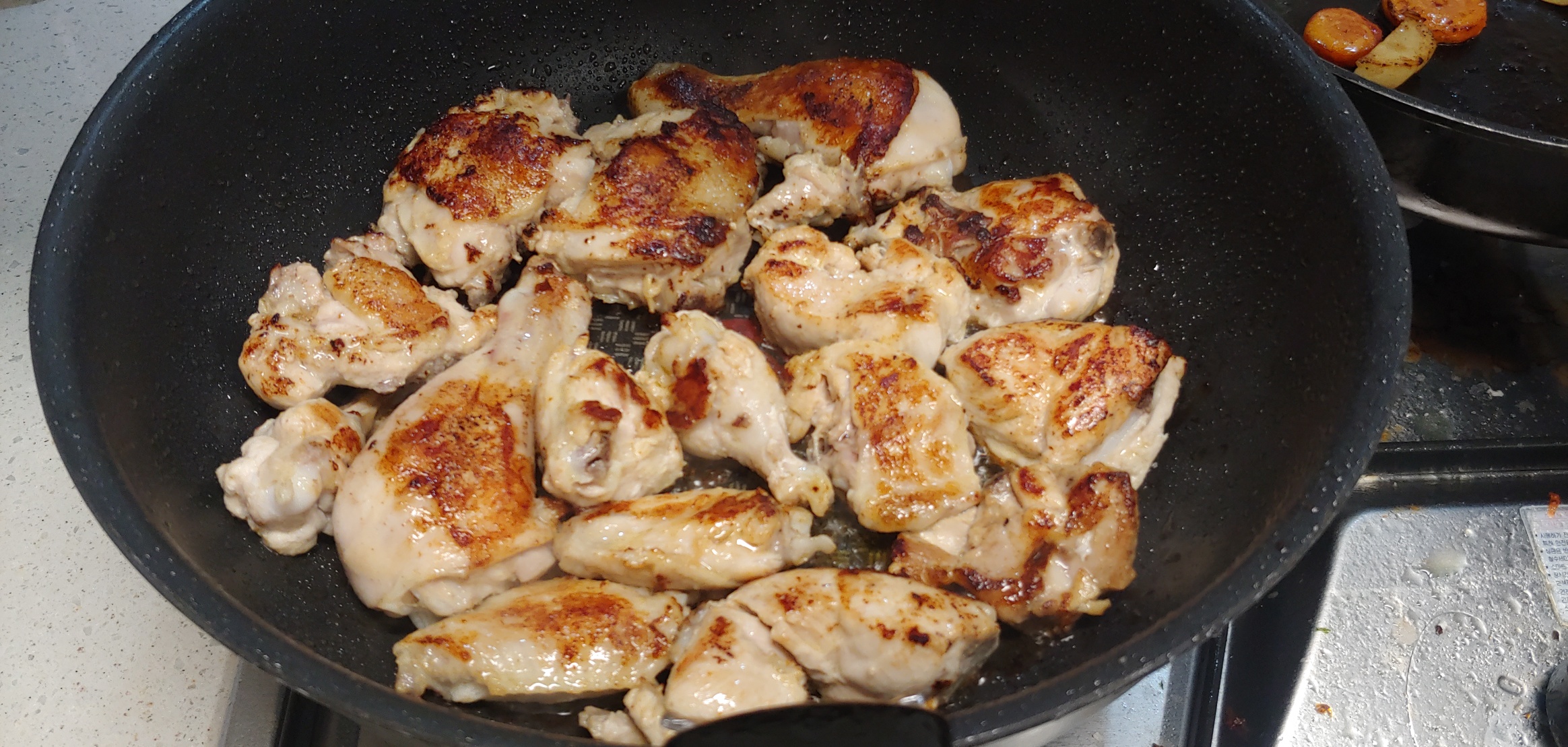 5. 2의 닭을 채에 물에 씻어줍니다. 팬에 오일을 두르고 강불로 올린 다음 닭의 껍질 부분이 팬에 닿게끔 올려서 익힙니다. 다른 팬에는 감자와 당근을 같이 익혀줍니다.
