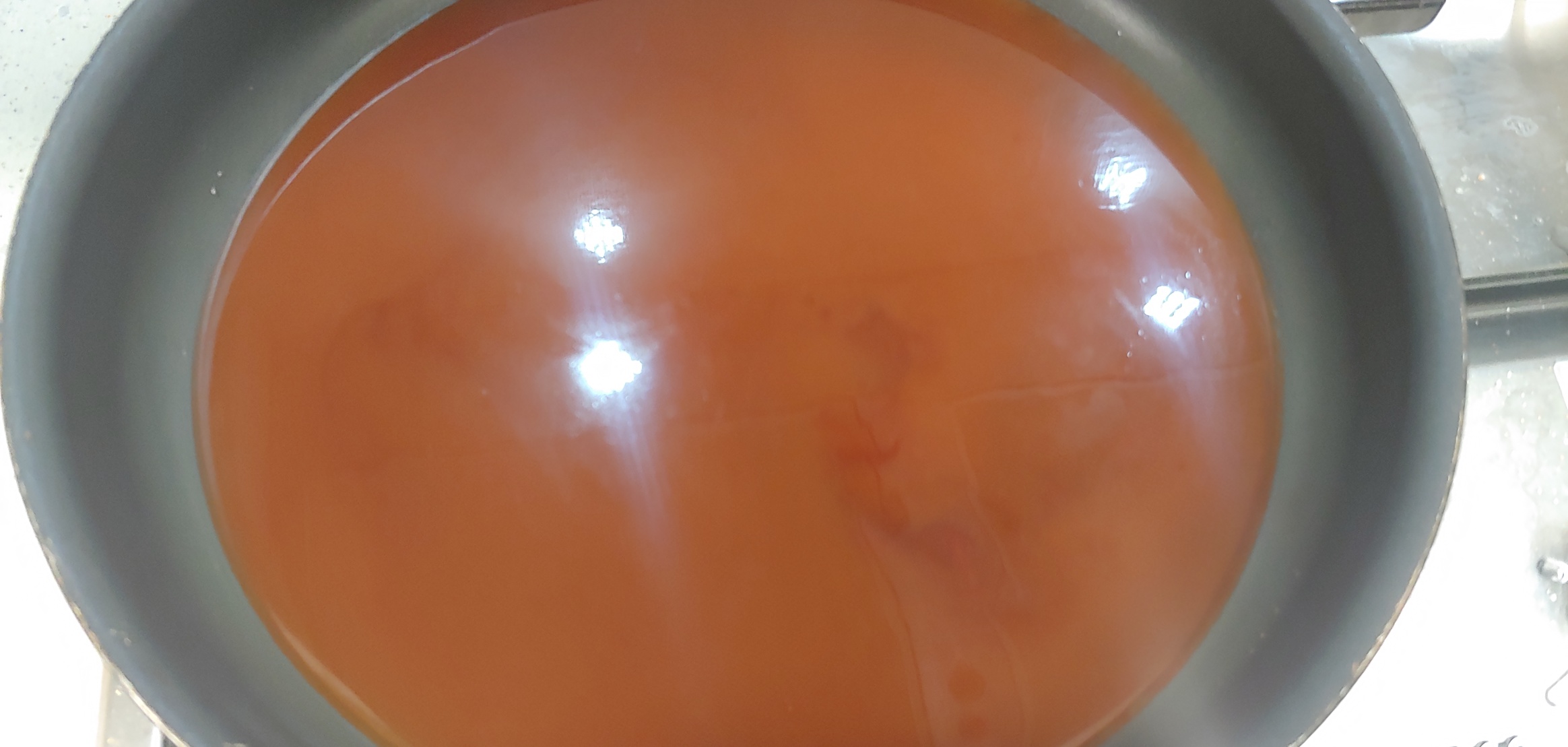 1. 소스를 먼저 만들어 줍니다. 팬에 돈까츠 소스 4T, 케첩 2T, 올리고당 2T, 굴소스 1T를 넣어 끓여줍니다.