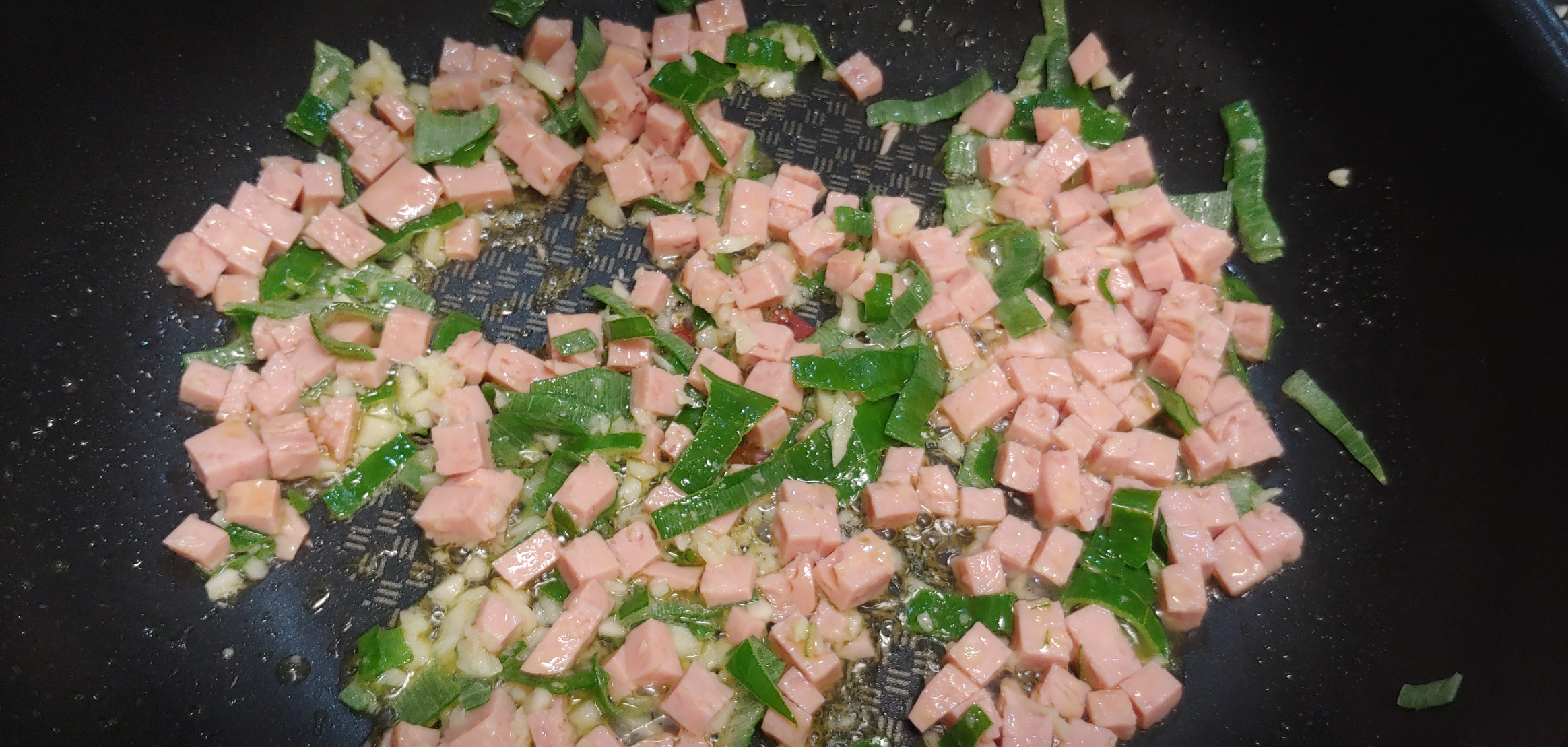 3. 팬에 오일 2T를 두르고 먼저 파와 마늘을 중불에 볶아줍니다. 그 후 마늘 익는 냄새가 나기 시작하면 썰어놓은 스팸을 모두 넣어주시고 볶아주세요.