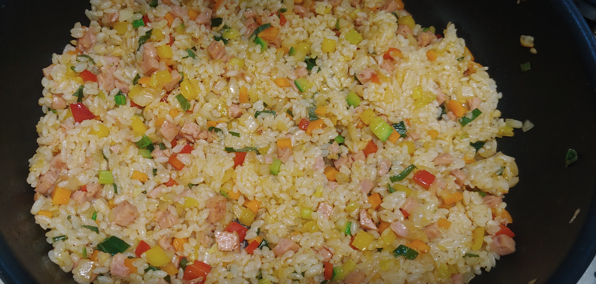 4. 남은 양파와 파프리카, 당근, 애호박을 모두 넣고 빠르게 저어주며 볶아줍니다. 당근이 익을 때쯤 소금과 후추를 한 꼬집 뿌려주고, 케첩 2T를 넣어 살짝 볶아주세요. 마지막으로, 밥을 넣어주시고 같이 볶아주세요. 다 볶은밥은 그릇에 담아줍니다.