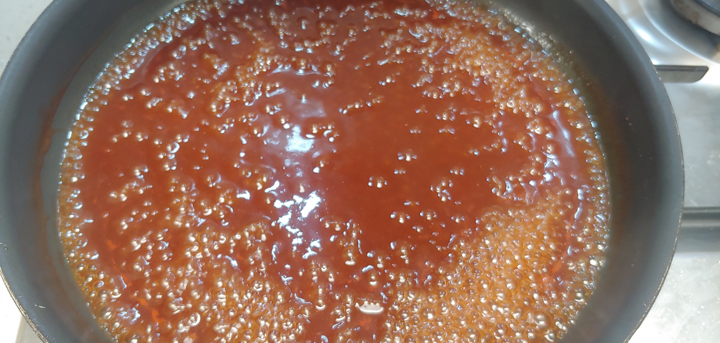 1. 소스를 먼저 만들어 줍니다. 팬에 돈까츠 소스 4T, 케첩 2T, 올리고당 2T, 굴소스 1T를 넣어 끓여줍니다.